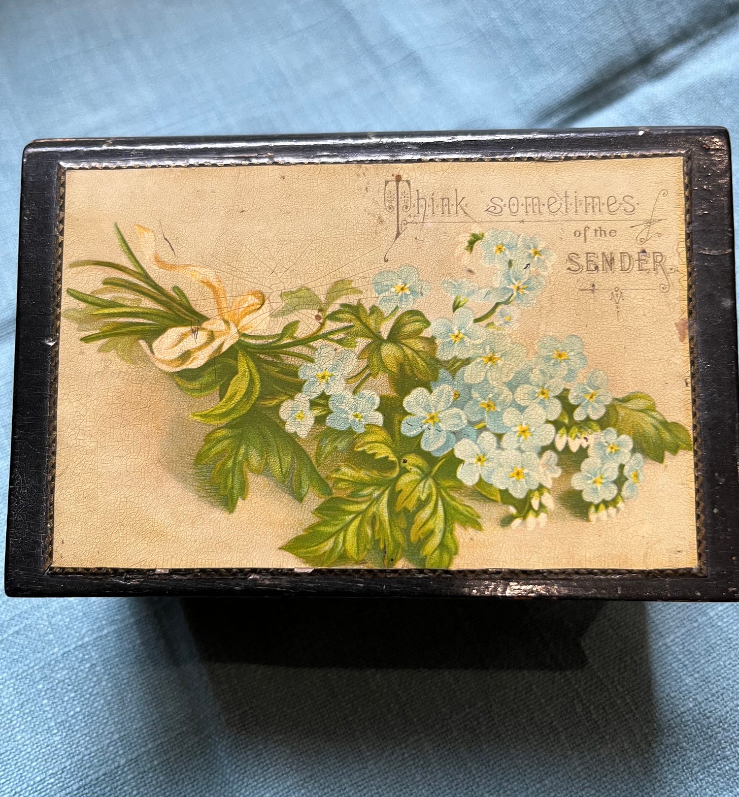 A vintage decoupage box with a lover’s message: “Think sometimes of the Sender”