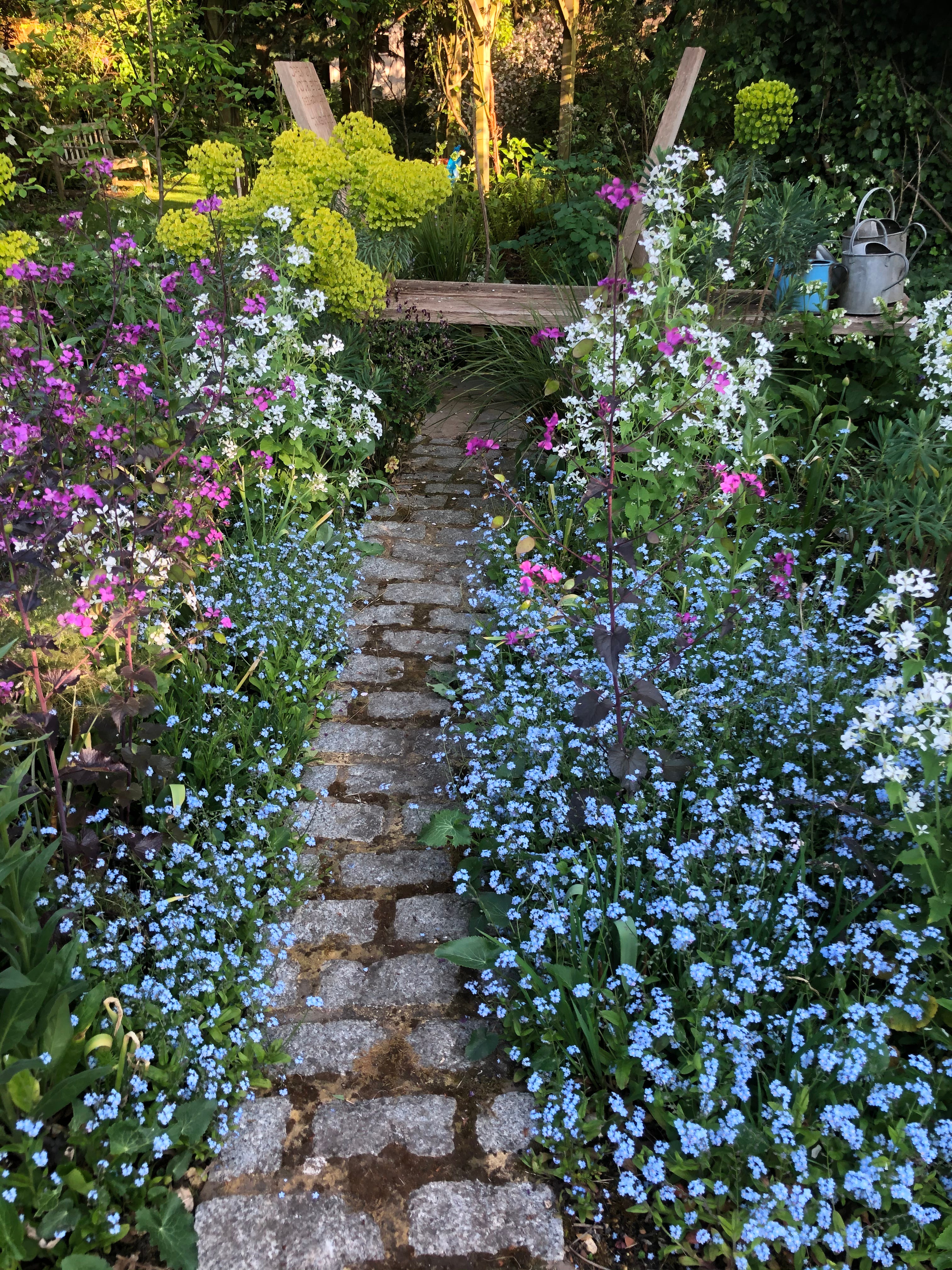 Once you’ve got forget-me-nots, you’ll never be without them: they seed everywhere. The tiny seed pods and stems are slightly sticky and attach themselves to anything they brush against, including my gardening clothes and the dog’s coat, so the seeds are always spread. Annoyingly, seedlings spring up in the lawn and along the hoggin path that snakes up through my garden as well as the places I do want them!