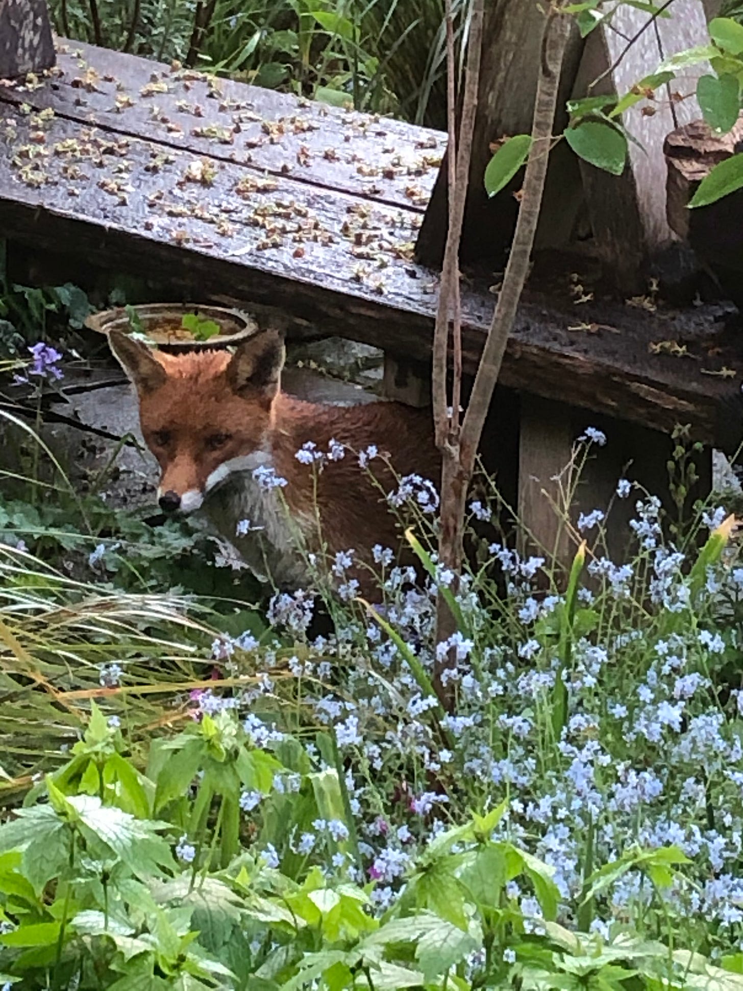Forget-me-nots after heavy rain, with a rather handsome visitor