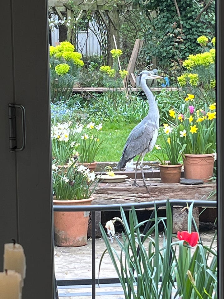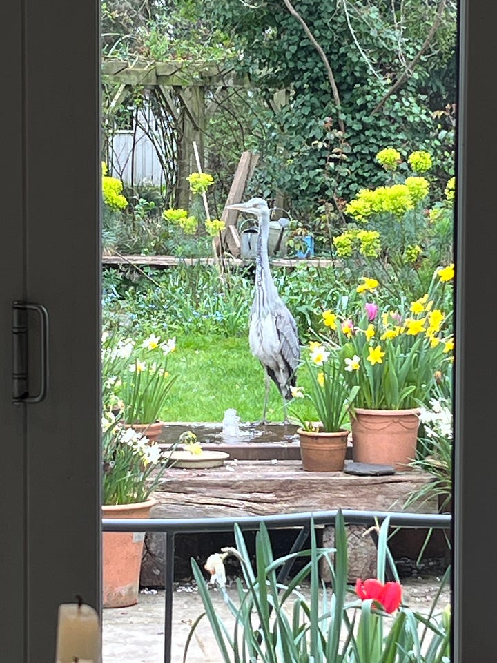 I also wanted to share a couple of pictures with you. We had an unexpected visitor this week! This heron arrived at the water feature in the garden, presumably hoping it might find some fish for lunch. Even though it discovered the water was only an inch deep and didn’t contain anything of interest, it hung around long enough for me to take a whole string of photos through the kitchen window. Here are two of the best.